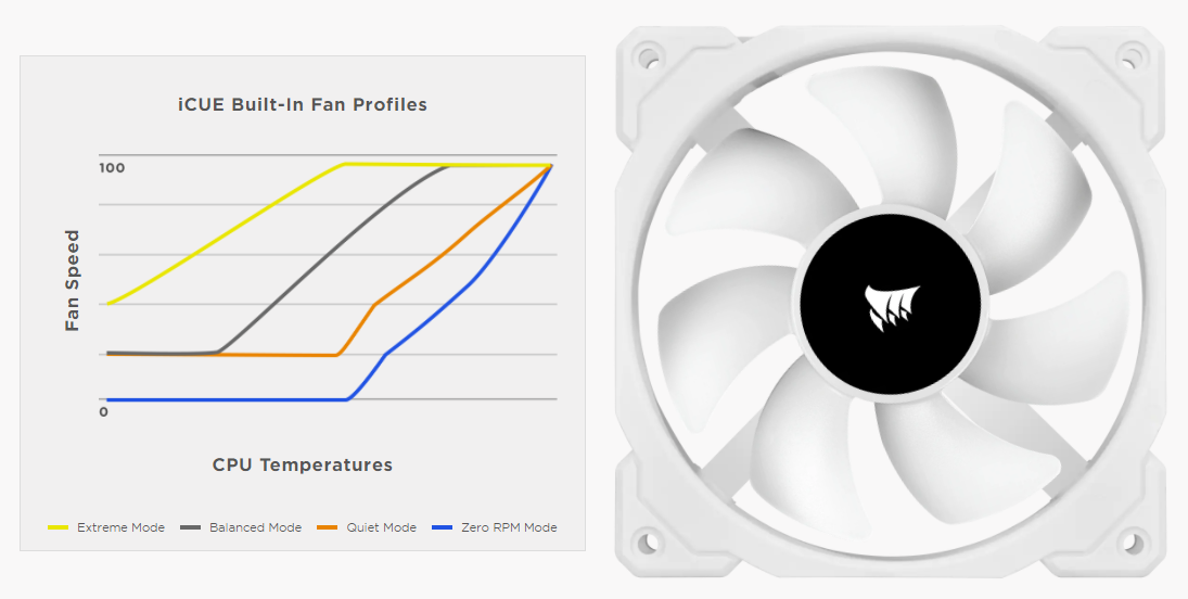 Cấu hình làm mát Zero RPM trong phần mềm CORSAIR iCUE cho phép quạt dừng hoàn toàn ở nhiệt độ thấp, loại bỏ tiếng ồn của quạt. |