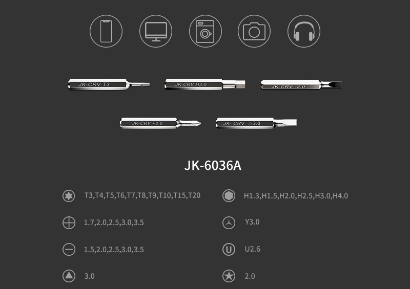 – Bộ Tuốt nơ vít đa năng 31 chi tiết JK-6036A được làm bằng thép CRV siêu cứng, thích hợp dùng để sửa chữa điện thoại, laptop, đồng hồ, hàng điện tử các loại.