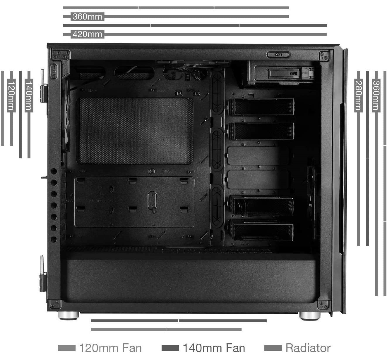 Tăng cường khả năng làm mát Nội thất chứa tối đa 9 x Fan 120mm hoặc 7 x Fan 140mm hoặc nhiều bộ tản nhiệt với kích thước lên đến 420mm. |