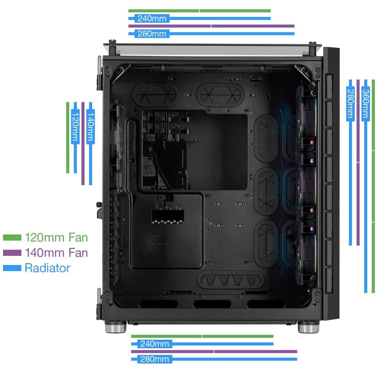 680X RGB với thiết kế làm mát hai buồng. Trong khi một buồng được làm mát tích cực với nhiều giá gắn quạt và bộ tản nhiệt, buồng kia cung cấp không gian rộng rãi cho việc định tuyến cáp, lưu trữ ổ đĩa và gắn PSU, giúp việc lắp ráp một hệ thống hoàn hảo dễ dàng hơn bao giờ hết. |