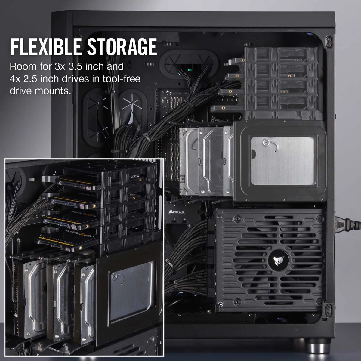 Không gian lưu trữ Khoang lưu trữ chuyên dụng cho tối đa ba ổ đĩa 3,5 inch và bốn ổ 2,5 inch trong giá gắn ổ đĩa để có cấu hình lưu trữ linh hoạt, dung lượng cao. |
